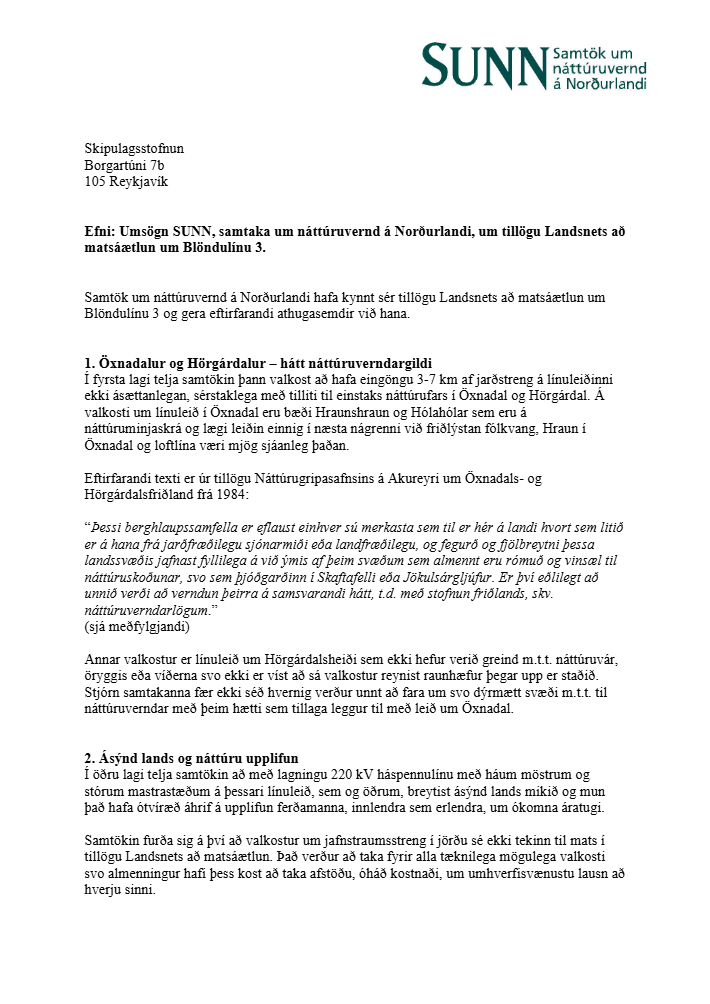 Athugasemdir SUNN vegna tillögu að matsáætlun vegna mats á umhverfisáhrifum Blöndulínu 3